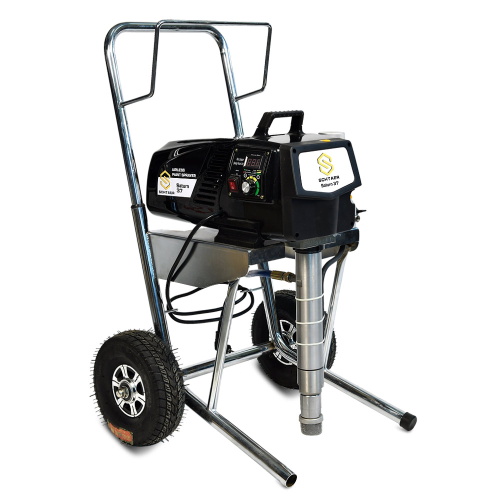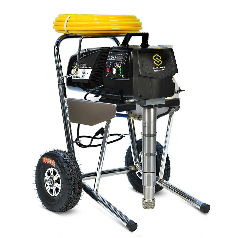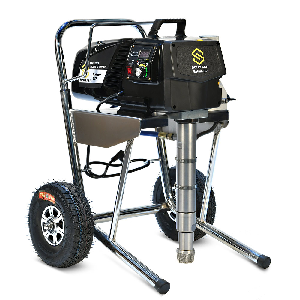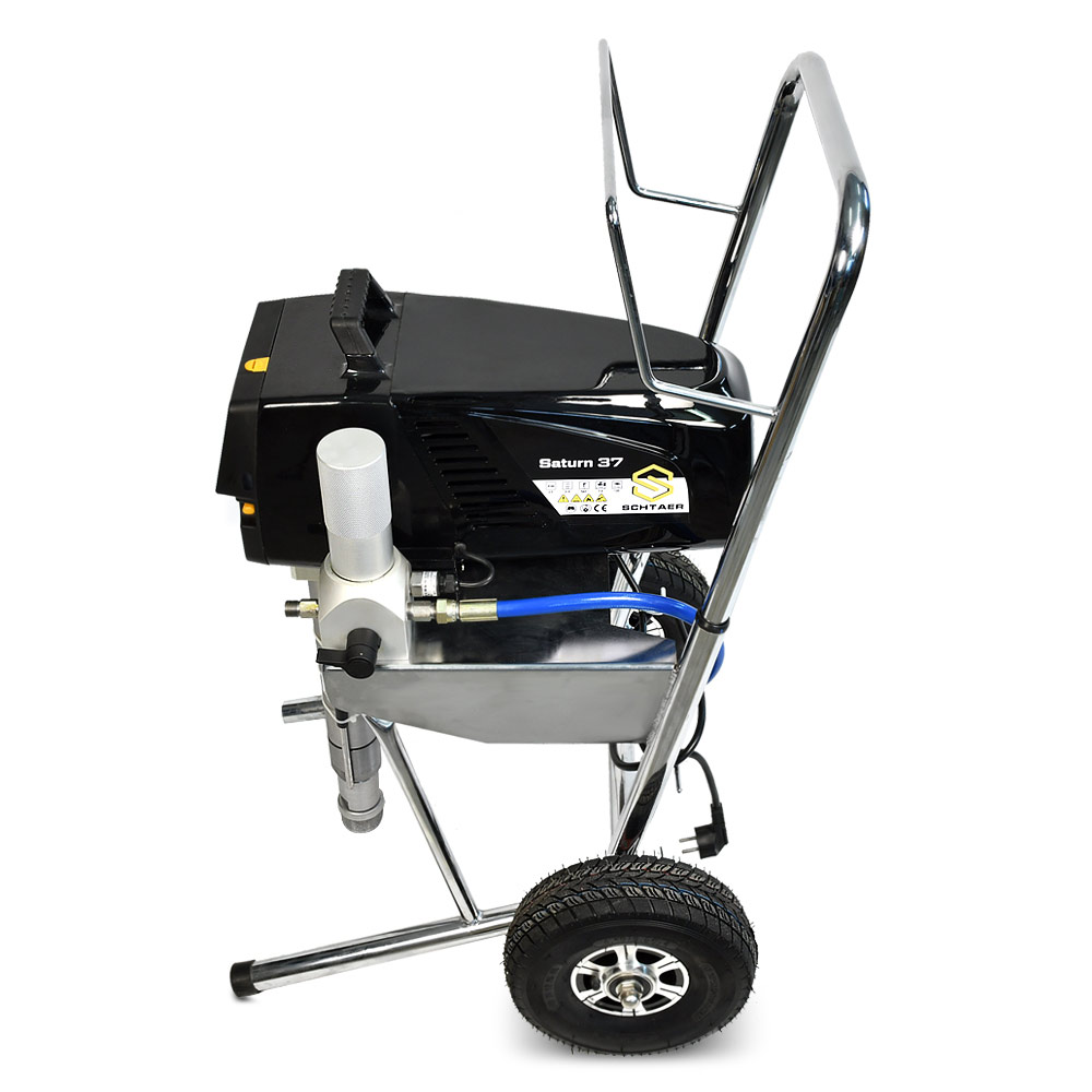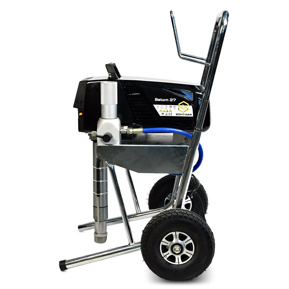 Schtaer Saturn 37 — покрасочный аппарат высокого давления для безвоздушного распыления вязких красок используется для работы на строительной площадке, покраски фасадов, стен и потолков, грунтовки и окраски металлоконструкций, покраски деревянных стен и заборов, нанесения огнезащитных красок на металлоконструкции, распыляемой безвоздушным способом шпатлевки, гидроизоляционных материалов, предназначенных для безвоздушного распыления. Поршневой окрасочный аппарат SATURN 37 забирает краску из ведра через прямой металлический заборник и подает ее по шлангу высокого давления на краскопульт высокого давления.Стандартная комплектация