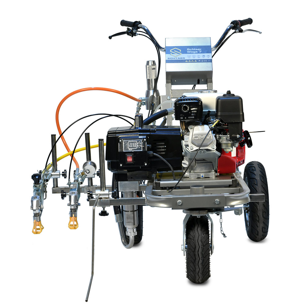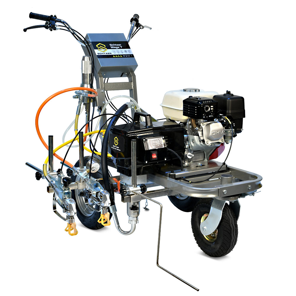 Schtaer WEGA 7 - разметочная машина для безвоздушного нанесения дорожной разметки краской на асфальт. Разметочная машина собрана на базе поршневого насоса для краски и бензинового двигателя. Машину для нанесения дорожной краски можно толкать, также ее можно использовать как подающий поршневой насос с бензиновым двигателем и держать машину в кузове грузовика, и наносить краску окрасочным пистолетом вручную по шаблону. Машина может наносить как прямые линии, так прерывистые. Также, благодаря переднему поворотному колесу, можно наносить радиусы, фиксируя переднее колесо под нужным углом. Машина может наносить двойные сплошные и прерывистые линии, пешеходные переходы. Максимальная длина шланга 90 метров. Сопло 1908.