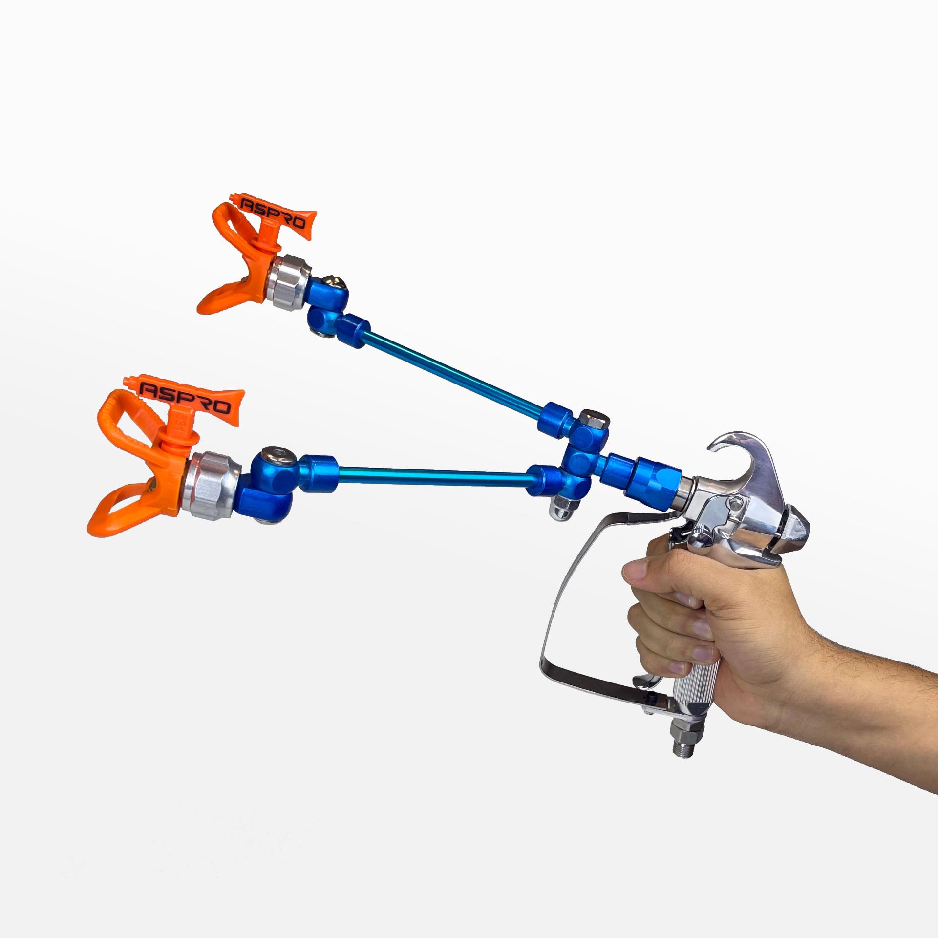 Применение этого устройства позволяет увеличить скорость окраски поверхности в 2 раза. Соплодержатель с соплом устанавливается на каждую из двух удлинительных трубок. Затем устанавливается необходимый угол разведения трубок, соответствующий ширине факела каждого сопла с учетом необходимого перекрытия.