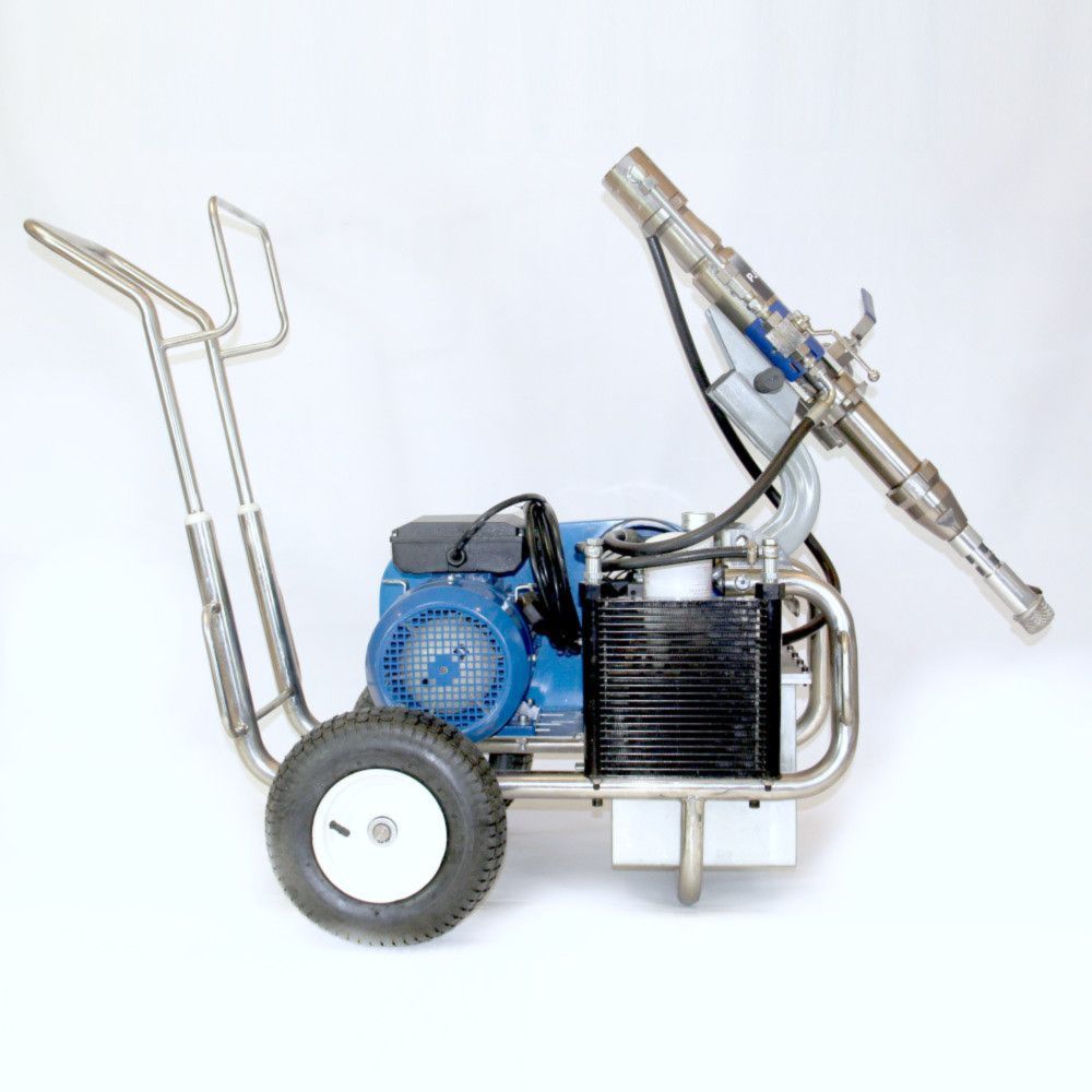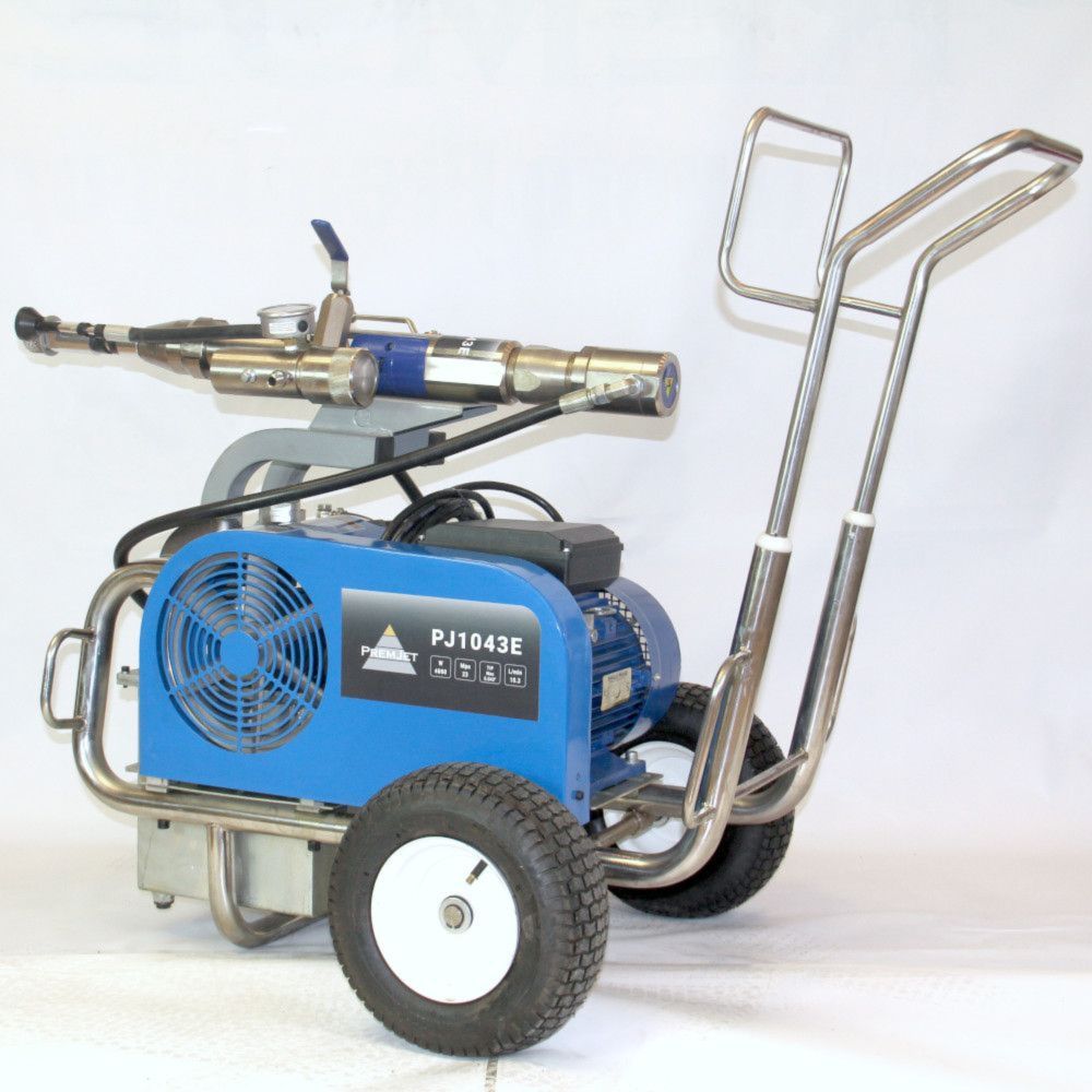Безвоздушный окрасочный аппарат PremJet PJ 1043E с электрическим приводом и пневматическим насосом предназначен для профессионального применения ЛКМ высокой вязкости с содержанием абразивов для грунтования и окраса больших объёмов в промышленности и на производстве, для нанесения полимерной шпатлёвки, огнезащитных и двух компонентных составов с одновременным применением двух краскораспылителей.