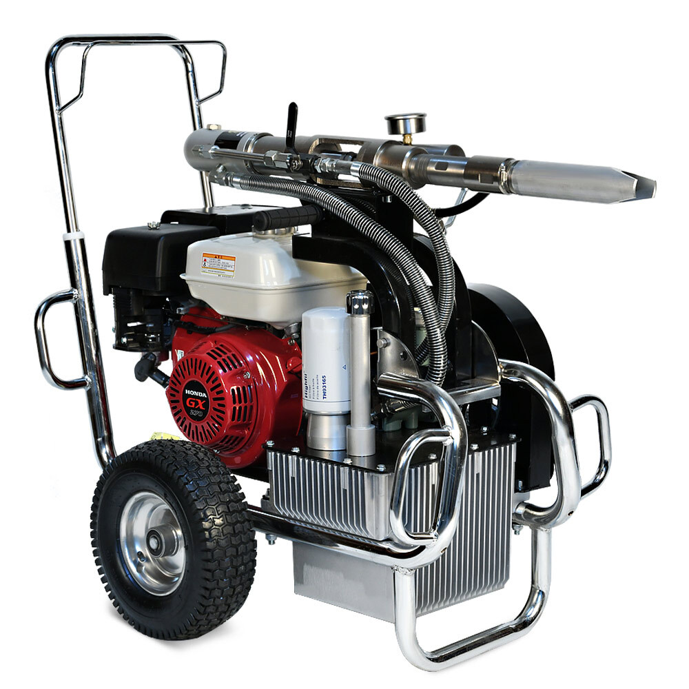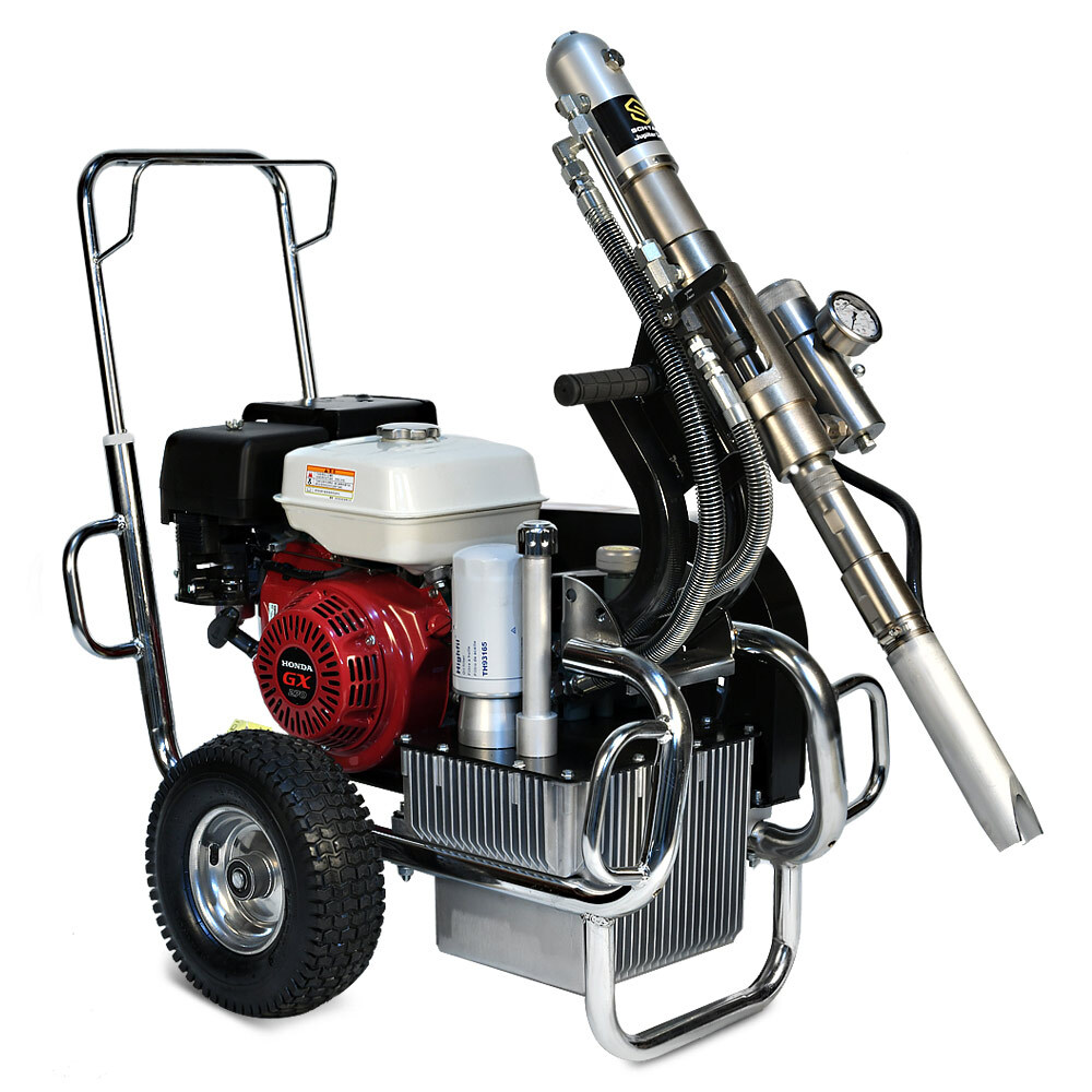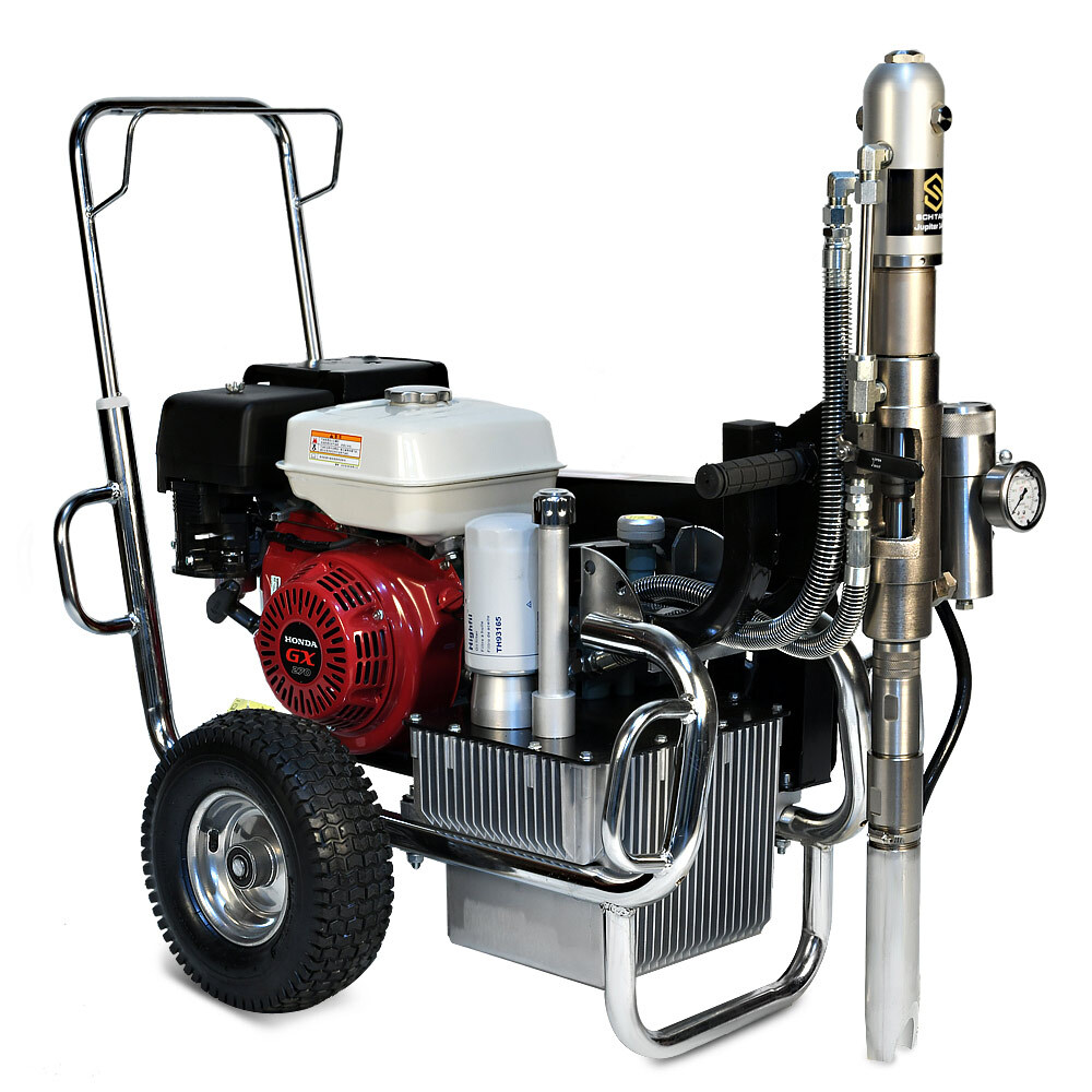 Schtaer Jupiter 14G – это безвоздушный бензиновый окрасочный аппарат, предназначенный для распыления красок с высокой степенью вязкости. Его также используют при работе с огнезащитными составами, гидроизоляционными материалами, антикоррозионными красками, шпатлевками, цинконаполненными материалами, эмалями, мастиками, грунтовками и другими лакокрасочными материалами, предназначенными для нанесения через поршневой безвоздушный окрасочный аппарат. Сферы применения этой модели разнообразны. Ее используют для покраски стен, фасадов и потолков, металлических конструкций, бассейнов, крыш и куполов. Она может применяться при работе с балками, заборами, мостами и тоннелями, изготовленными из металла. Профессиональный аппарат подходит для нанесения дорожной разметки, но при этом потребуется дополнительное оборудование. Модель обладает высокой производительностью (14 л/мин), работает под давлением 230 Бар при мощности 4 000 Вт.