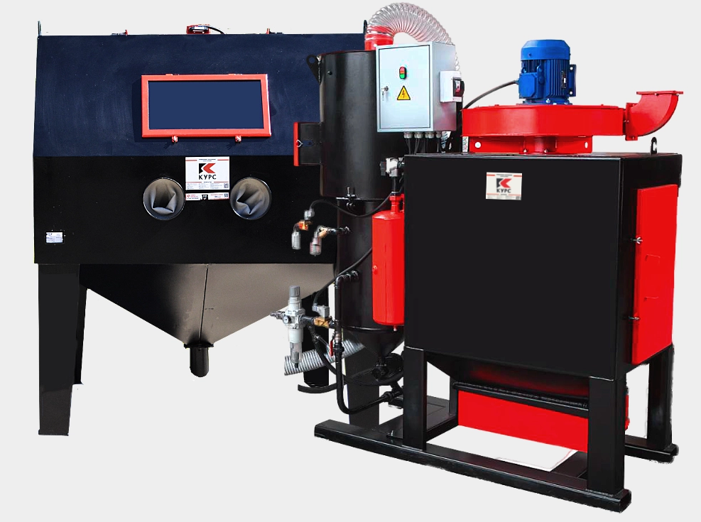 Фильтр-вентилятор мощностью 4 кВт с рекуператором абразива — дополнительная установка к камере, он выполняет функцию очистки запыленного внутреннего пространства пескоструйной камеры, а также очистки, просеивания абразива от пыли, крупных примесей и подачи его под давлением в зону обработки. Фильтр улавливает пыль, мелкие частицы абразива. Благодаря фильтру и рекуператору в атмосферу подается уже очищенный воздух, а загруженный абразив может используется многократно и длительное время.