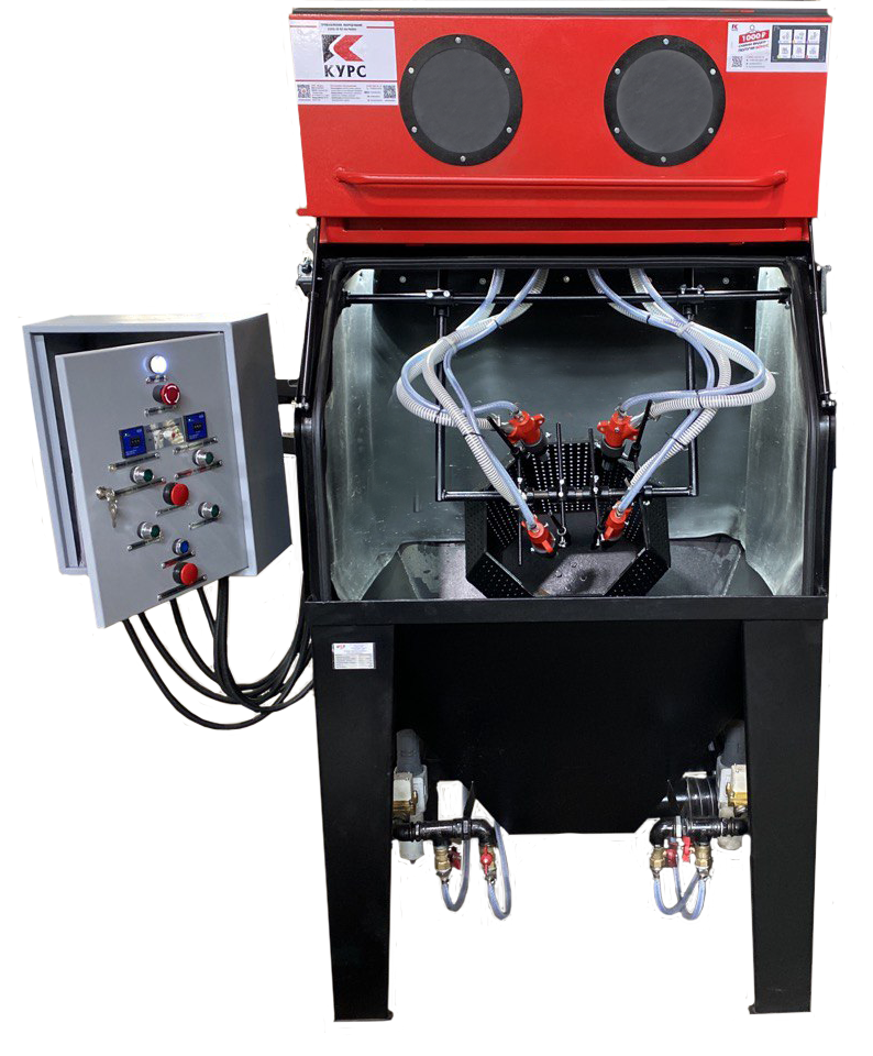 В процессе обработки абразивная смесь попадает в бункер камеры. Когда работа закончена, оператор отключает камеру на пульте управления (либо камера отключается по выставленному таймеру на пульте управления), подача абразива прекращается, кабину можно открыть и выгрузить обработанные изделия.